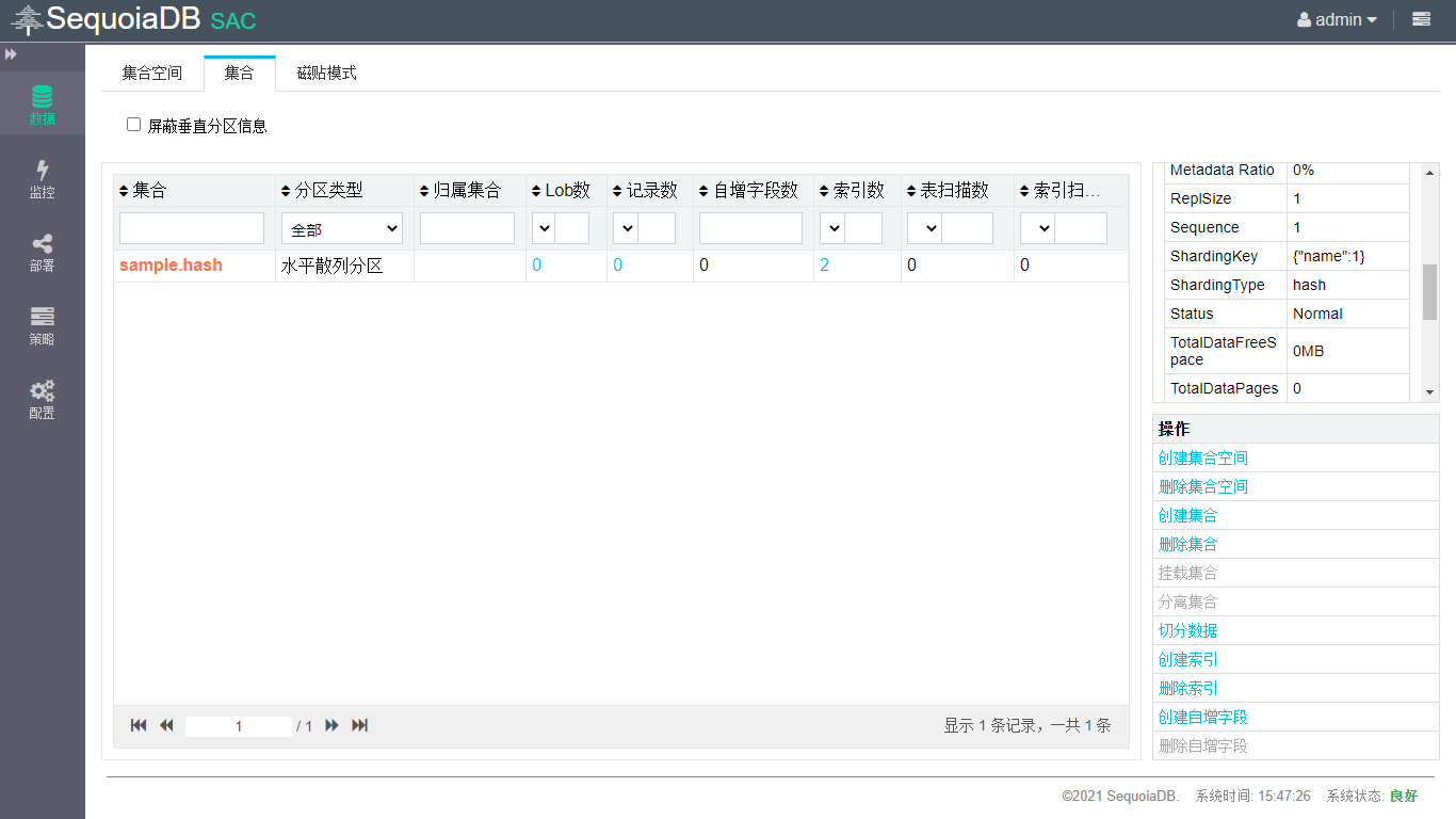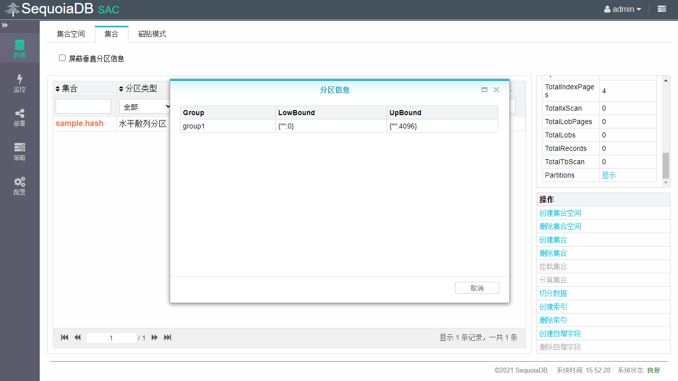 点击集合列中的集合名 sample.main,在集合属性【Partitions】点击 显示 按钮查看是否分离成功