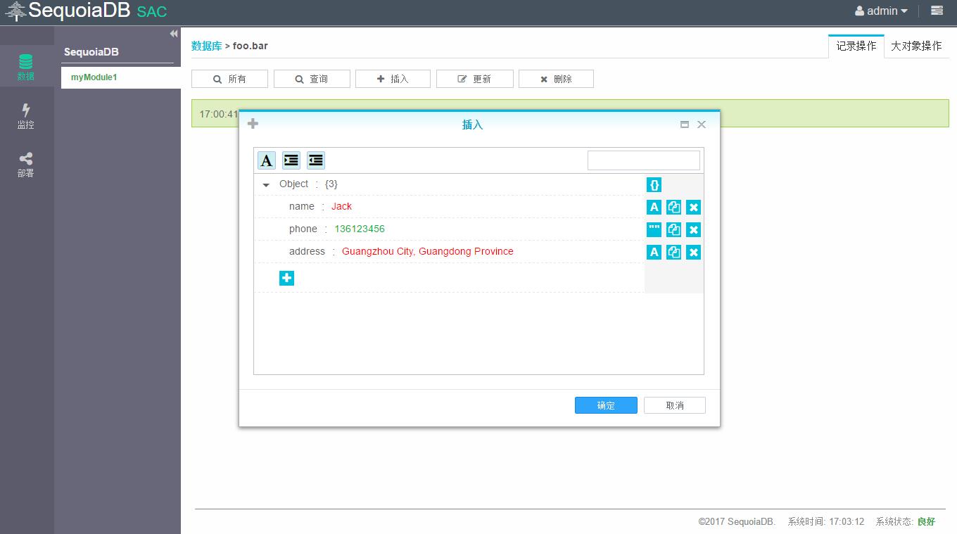 通过图形化JSON编辑界面构造一条记录,点击 确定。
