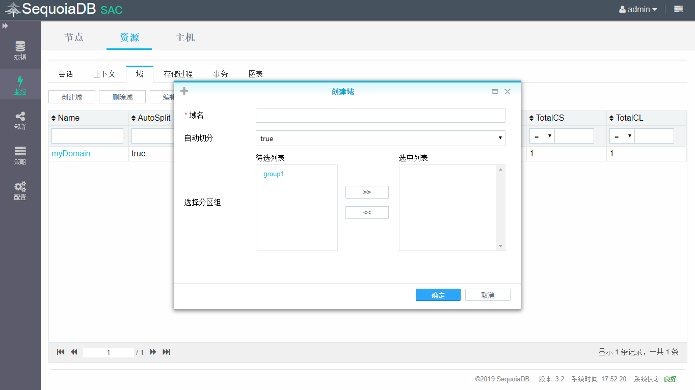 该页面会列出所有由用户创建的域的基本信息,包括域的分区组列表、集合空间列表、集合列表和是否自动切分等信息。