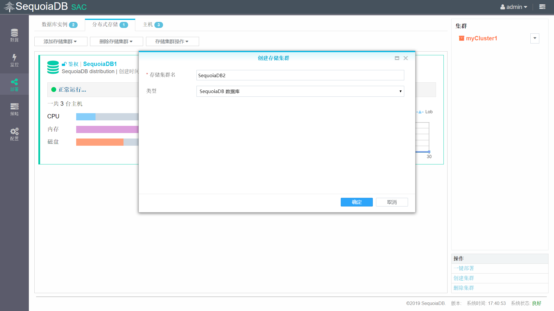 在【部署】页面点击【添加存储集群】->【创建存储集群】按钮,服务类型选择 SequoiaDB 数据库,点击 确定 按钮